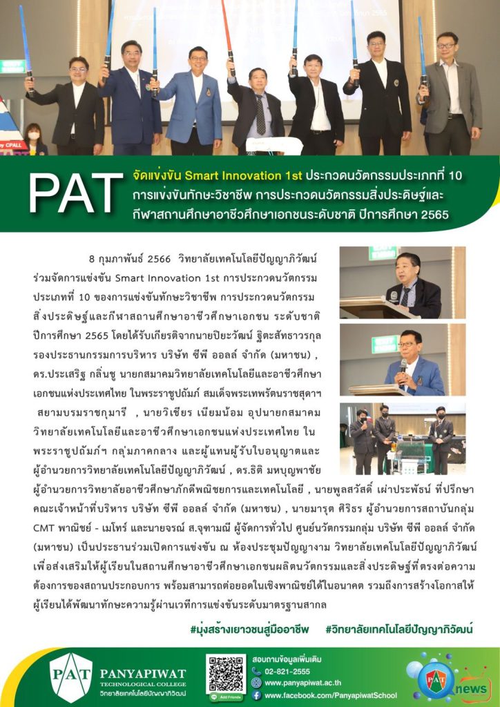 PAT ผลการแข่งขัน Smart Innovation 1st ประกวดนวัตกรรมประเภทที่ 10 การแข่งขันทักษะวิชาชีพ การประกวดนวัตกรรมสิ่งประดิษฐ์และกีฬาสถานศึกษาอาชีวศึกษาเอกชน ระดับชาติ ปีการศึกษา 2565