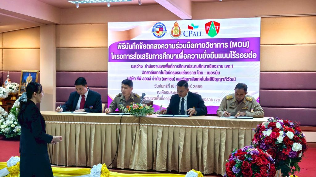 16 กุมภาพันธ์ 2569 บริษัท ซีพีออลล์ จำกัด (มหาชน) ร่วมกับวิทยาลัยเทคโนโลยีปัญญาภิวัฒน์ โดย ดร.ฉัชร์ภิมุก อภินันท์โชติสกุล ผู้อำนวยการกลยุทธ์การศึกษาและพัฒนาธุรกิจ ผนึกความร่วมมือกับสำนักงานเขตพื้นที่การศึกษาประถมศึกษาเชียงราย เขต 1 และวิทยาลัยเทคโนโลยีกรุงธนเชียงราย ไทย-เยอรมัน จัดพิธีลงนามบันทึกข้อตกลงความร่วมมือทางวิชาการ (MOU) โครงการ “ส่งเสริมการศึกษาเพื่อความยั่งยืนแบบไร้รอยต่อ สำหรับเยาวชนกลุ่มชาติพันธุ์” เพื่อเปิดโอกาสทางการศึกษาด้านวิชาชีพในหลักสูตรระดับประกาศนียบัตรวิชาชีพ (ปวช.) และประกาศนียบัตรวิชาชีพชั้นสูง (ปวส.) สาขาธุรกิจค้าปลีก